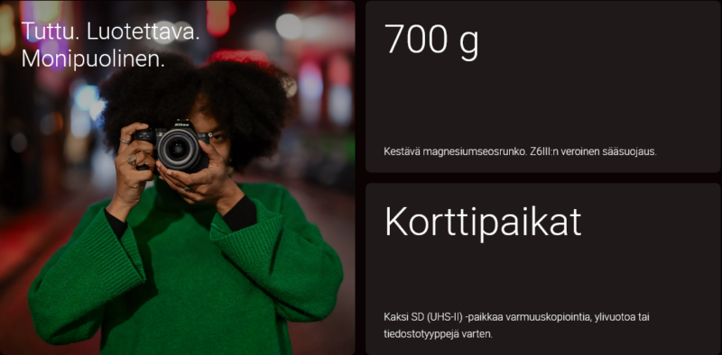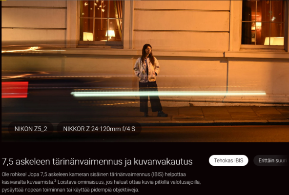 Tutustu täyden kennokoon valokuvaukseen peilittömällä Z5II-kameralla, niin saat enemmän yksityiskohtia, syvyyttä ja tilaa luovaa ilmaisua varten. Suuri Z-bajonetti ja täyden kennokoon IBIS (In-Body Image Stabilisation, kameran sisäinen tärinänvaimennus) tarjoavat uskomattomia mahdollisuuksia käsivaralta kuvaamiseen missä tahansa valossa – ja millä tahansa objektiivilla. Tehokkain kuvaprosessorimme lisää suorituskykyä entisestään tuomalla lisää nopeutta ja sujuvuutta kaikkeen, mitä teet.
