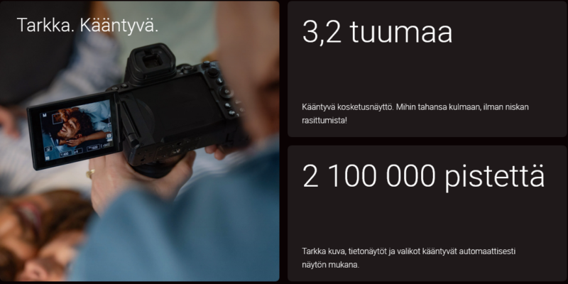 Upeat värit, erittäin tarkka automaattitarkennus ja useiden kuvataajuuksien joustavuus. Nauti mahdollisimman tarkoista yksityiskohdista 4K/30p-asetuksella tai valitse asetukseksi jopa 4K/60p (rajattu). Tallenna erittäin sujuvia hidastettuja videoita Full HD / 120p -muodossa.