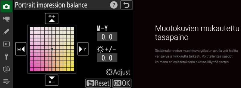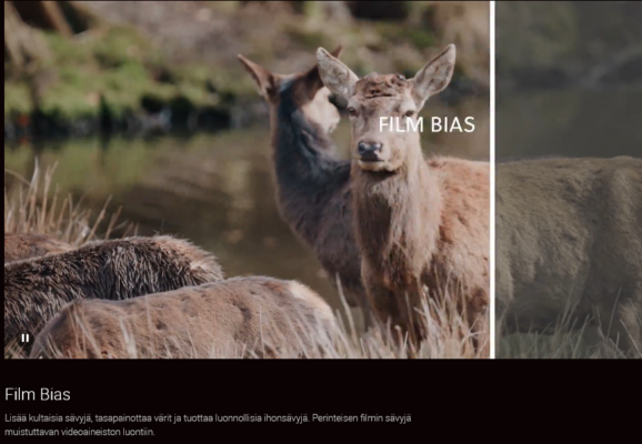 Jos haluat suorittaa videoaineiston värimäärittelyn, voit tallentaa videon N-log-muodossa. Suuri dynaaminen alue säilyttää enemmän yksityiskohtia varjo- ja huippuvaloalueilla, mikä lisää joustavuutta jälkikäsittelyn aikana.